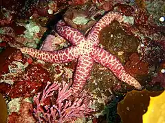 C'est une étoile régulière, constituée d'un disque central assez réduit autour duquel rayonnent 5 longs bras cylindriques beige pâle, recouverts de touffes de papules roses ou orangées.