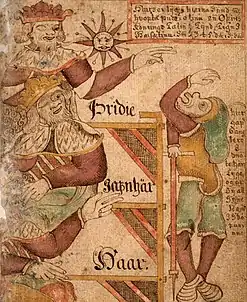 Couverture d'un manuscrit de l'Edda de Snorri illustré par Ólafur Brynjúlfsson (1760). Copenhague, Bibliothèque royale. Sont représentés les corbeaux Hugin et Munin, entourant Odin, le foret Rati, la vache Audhumla, le loup Fenrir, la Valhöll, le cheval Sleipnir, Heimdall et son cor Gjallarhorn et le marteau Mjöllnir | |