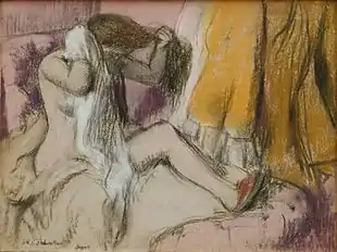 Même à la fin de sa carrière, Degas n’abandonna pas l’approche académique qui consiste à mettre en place une composition à l’aide de dessins préparatoires, et notamment d’études d’après modèle vivant. De la même façon qu’il préparait ses tableaux d’histoire, il a souvent recours au dessin pour ses dernières scènes de la vie moderne. Il continue à appliquer les préceptes d’Ingres. Se souvenant des nus féminins d’Ingres comme La Baigneuse Valpinçon, il dessine ses femmes à leur toilette, en cernant d’un trait sombre et sensuel les contours de leur corps.