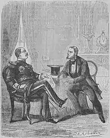Muni de ce document assez anodin, Régnier part pour le continent et arrive le 20 septembre au château de Ferrières, où le chancelier Bismarck s'est établi et où il vient d'accueillir Jules Favre, ministre des Affaires étrangères du gouvernement de la Défense nationale, pour lui exposer ses conditions d'un armistice. Les négociations avec le gouvernement républicain étant dans l'impasse, Bismarck est satisfait de trouver en Régnier un émissaire officieux qui pourrait lui permettre de contourner le gouvernement de facto et de traiter avec les éminences bonapartistes. Le chancelier accepte par conséquent de recevoir Régnier et de lui fournir un sauf-conduit. En contrepartie, Régnier s'engage à se rendre à Metz, alors assiégée, pour y inciter le maréchal Bazaine, commandant de l'armée du Rhin, à accepter de capituler en échange d'une paix honorable et du rétablissement du régime impérial[16].