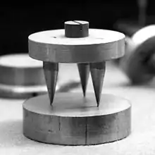 « Trois tiges métalliques, de même nature, parallèles, de 2 mm de diamètre environ, sont réunies à leur partie supérieure par un disque qui les relie à l'un des pôles d'un élément de pile ; les extrémités inférieures, de diamètre réduit, nettoyées, polies, puis oxydées, reposent librement sur un plan d'acier poli, relié au second pôle de l'élément de pile […] »