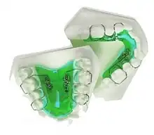 - Appareil à broches et tubes " (1910) - Constitué de bandes en or et en platine, il était fixé à toutes les dents. Ces bagues étaient munies de tubes verticaux qui étaient soudés et dans lesquels on faisait passer une broche pour obtenir un mouvement de la dent. Le parallélisme et la rotation des racines étaient difficiles à obtenir avec cet appareil. De plus, les broches devaient être repositionnées à chaque rendez-vous par le biais du processus de ressoudage.