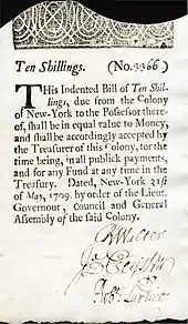 En 1690, la Province de la baie du Massachusetts émet la première sa propre monnaie papier, sous la forme de colonial scrips. Par la suite, une à une, les douze autres colonies se mettent à en produire[2].