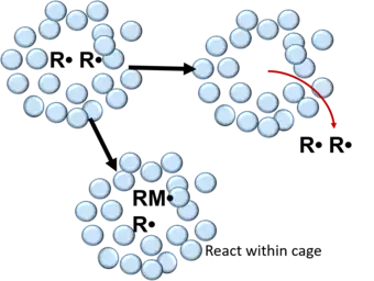 Après recombinaison, les radicaux peuvent soit réagir avec des monomères composant le pourtour de la cage ou bien diffuser librement hors de la cage. Pour les polymères, la probabilité qu'un radical s'apparie pour échapper à la recombinaison au sein de la cage est de l'ordre de 0,1 à 0,01 et de l'ordre de 0,3 à 0,8 dans les liquides[2].