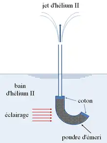 Quand on éclaire le tube, les grains de la poudre absorbent les radiations lumineuses et produisent ainsi de la chaleur, créant un gradient de température. Par un phénomène de convection, l'hélium II du bain est transporté vers la zone réchauffée du tube. Ceci provoque l'émission continue d'un jet d'hélium pouvant atteindre plusieurs dizaines de centimètres de haut à la sortie du tube, émission qui cesse lorsque l'émeri n'est plus éclairé. Une autre méthode de chauffage ponctuel consiste à faire circuler un courant électrique dans une résistance placée à l'intérieur du tube.