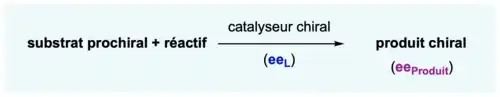 Une réaction asymétrique catalytique peut être représentée suivant l'équation chimique suivante :