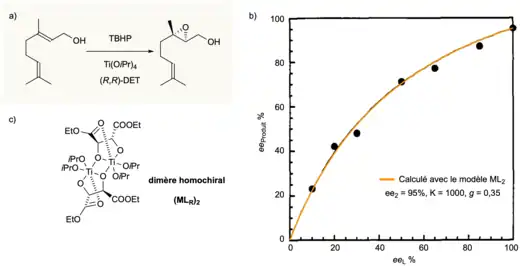 Les effets non linéaires de la réaction de Sharpless ont été étudiés avec le géraniol comme substrat par Kagan dès 1986 (figure 10a)[6]. L'effet non linéaire observé est un effet non linéaire positif avec une légère amplification asymétrique comme le montre la figure 10b. En appliquant le modèle de type ML2, il est possible d'avoir une bonne prédiction de la courbe avec les paramètres indiqués sur la figure. Les résultats sont cohérents avec les études menées par Barry Sharpless qui suggéra une espèce dimérique comme espèce active (donc de type (ML)2)[9]. La valeur de g dans la simulation est de 0,35 c'est-à-dire que k'2/k2 ≈ 1/3 ce qui suggère que l'espèce dimère (ML)2 homochirale (figure 10c) est trois fois plus réactive que l'espèce homochirale.