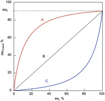 Pour une réaction asymétrique idéale, le eeProduit peut être décrit comme le produit de ee0 multiplié par le eeL (ee0 est la valeur de l'excès énantiomérique du produit obtenue avec le catalyseur énantiopur). Donc eeproduit = 0,9 × 0,5 = 0,45, soit 45 % ee.