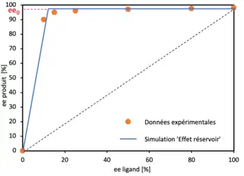 Ce modèle simple ne prenant pas en compte les paramètres cinétiques de la réaction permet de comprendre comment une amplification asymétrique est possible par piégeage d'une partie des espèces catalytiques actives. Le modèle peut être appliqué à des résultats expérimentaux, la figure 4 superpose le modèle « effet réservoir » avec les résultats obtenus pour la réaction d'alkylation de ZnEt2 sur le benzaldéhyde en présence du ligand chiral DAIB[7]. Ce modèle reste cependant très simple et ne peut donner que des droites comme simulation ce qui est éloigné de la réalité expérimentale. Il ne prend pas en compte l'aspect cinétique des réactions et la fraction d'espèce inactive α est constante quelle que soit la valeur de eeL, ce qui ne correspond pas à la réalité des systèmes étudiés.