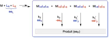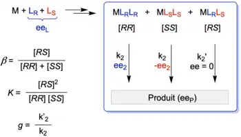 Le cas le plus simple serait l'assemblage de deux ligands chiraux avec un métal pour former un complexe, ce qui donne le modèle ML2. Dans un tel système, trois stéréoisomères sont possibles comme le montre la figure 5. Deux complexes homochiraux (MLRLR et MLSLS, qui donneront les produits avec les excès énantiomériques ee2 et -ee2, respectivement) et un complexe hétérochiral (MLRLS) (souvent appelé « composé méso ») qui donnera le produit racémique (ee = 0 %). Le produit de la catalyse est de ce fait obtenu à partir des trois catalyseurs en équilibre et qui fonctionnent simultanément. Par conséquent, l'excès énantiomérique du produit (eeP) dépendra de (i) l’ee du ligand (eeL), (ii) de la réactivité relative g, avec k2 et k2' étant les constantes cinétiques correspondantes et de (iii) la concentration relative en catalyseur β (avec [RR], [SS] et [RS] définis comme les concentrations individuelles des espèces MLRLR, MLSLS et MLRLS. K est la constante d'équilibre entre les espèces homochirales et hétérochirales.