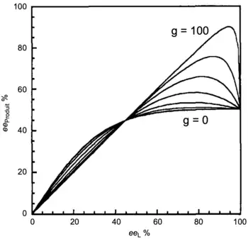 « Ce ne sera pas le cas pour les réactions présentant des effets non linéaires. »[3] Une énantiosélectivité supérieure (ou inférieure) à la valeur proportionnelle de l'excès énantiomérique du catalyseur est considérée comme un comportement non usuel. Cet écart par rapport à la linéarité est appelé « effet non linéaire » ou « NLE »[4].