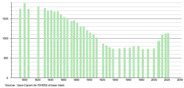L'évolution du nombre d'habitants est connue à travers les recensements de la population effectués dans la commune depuis 1793. Pour les communes de moins de 10 000 habitants, une enquête de recensement portant sur toute la population est réalisée tous les cinq ans, les populations légales des années intermédiaires étant quant à elles estimées par interpolation ou extrapolation[30]. Pour la commune, le premier recensement exhaustif entrant dans le cadre du nouveau dispositif a été réalisé en 2007[31].