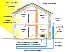 La directive du sur la performance énergétique des bâtiments[28] prévoit que les bâtiments construits après 2020 devront approcher le « zéro énergie », (consommation d'énergie « quasiment nulle » ; norme « Nearly zero energy »[29]) au (et dès 2018 pour les bâtiments publics), grâce aux énergies renouvelables et locales et/ou à l'utilisation des meilleures techniques d'isolation (habitat passif, etc.).
