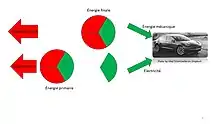 Même à partir de ressources fossiles, le gain de la chaîne électrique peut devenir ultérieurement très important en matière de rendement, et même plus favorable en matière de gaz à effet de serre que l'utilisation directe de carburant dans un véhicule thermique[16], grâce à la cogénération, ou au gaz, moins carboné, dans les centrales à cycle combiné.