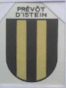 Istein appartenait à l'Évêque de Bâle depuis 1065[1]. En 1200, l'Évêque de Bâle fit construire un cloître pour Bénédictins de l'ordre clunisien qui restera modeste jusqu'à sa sécularisation en 1803, avec à sa tête un prévôt[2],[3]. Le 11 novembre 1409, jour de la Saint-Martin, parce que le nouveau châtelain qui détenait en fief de l'Évêque un des deux châteaux d'Istein eut le malheur d'avoir pris le parti des Autrichiens, les Bâlois aidés de Bernois et de Soleurois (5 000 au total) s'emparèrent des deux châteaux d'Istein situés à flanc de coteau et au sommet du rocher d'Istein pour en laisser qu'une garde de quinze hommes. Après s'en être vu confirmés dans leurs droits stratégiques en 1411, les citadins bâlois firent raser les deux châteaux à hauteur d'homme et emportèrent les meilleures pierres des tours pour construire le Riehentor au Petit-Bâle. En 1435, l'Évêque reprend les ruines d'Istein qui avec sa commune jumelle de Huttingen resteront principautois jusqu'au 12 décembre 1802, pareil à la Seigneurie de Schliengen, à laquelle Istein finit par être incorporée. La crosse épiscopale rouge a été reprise correctement dans les nouvelles armoiries d'Efringen-Kirchen[4].