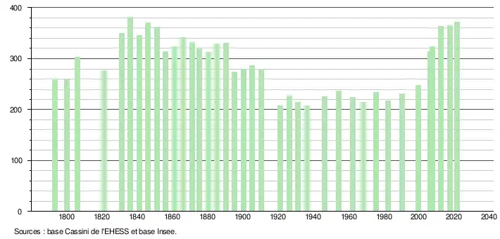 L'évolution du nombre d'habitants est connue à travers les recensements de la population effectués dans la commune depuis 1793. Pour les communes de moins de 10 000 habitants, une enquête de recensement portant sur toute la population est réalisée tous les cinq ans, les populations légales des années intermédiaires étant quant à elles estimées par interpolation ou extrapolation[18]. Pour la commune, le premier recensement exhaustif entrant dans le cadre du nouveau dispositif a été réalisé en 2007[19].
