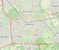 ![]() ![]() ![]() ![]() ![]() ![]() De haut en bas, gauche à droite : panorama urbain d'Eindhoven, l'église Saint-Antoine, l'église Sainte-Catherine, la tour de Vesteda, le musée Van Abbe, le Philips Stadion du PSV Eindhoven, et le campus High Tech d'Eindhoven. |