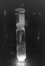 Tube de quartz (diamètre : 9 mm) contenant environ 300 µg d'einsteinium 253. La lumière produite est le résultat de intense émission de particules alpha issues de sa désintégration.  | |||||||||||||||||||||||||||||||||||||||||||||||||||||||||||||||||||||||||||||||||||||||||||||||||||||||||||||||||||||||||||||||||||||||||||||||||||||||||||||||||||||||||||||||||||||||||||||||||||||||||||