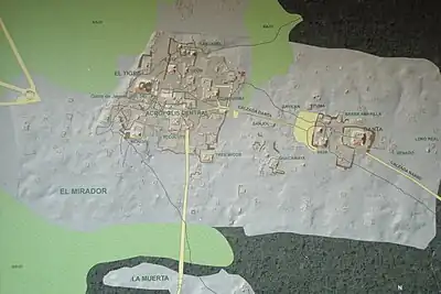 Le site s'étend probablement sur près de 16 km2[3]. D'ouest en est on distingue le Groupe Ouest et le complexe Danta reliés par un sacbé. Le Groupe Ouest se compose de plusieurs complexes, dont les plus connus sont le Complexe Tigre, l'Acropole centrale et le Complexe Monos. Cette partie du site est délimitée par une enceinte à l'est et au sud, tandis qu'à l'ouest il se termine par une pente escarpée. L'ensemble le plus impressionnant est le Complexe Tigre, dominé par la pyramide du même nom. La surface au sol de cet édifice haut de 54 mètres est six fois plus grande que celle du Temple IV de Tikal[4]. La pyramide est surmontée de trois structures, une grande flanquée de deux plus petites. Cet agencement en «triade» est caractéristique de l'architecture d'El Mirador et du Préclassique récent en général[5].