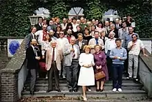 Elaine Morgan est à droite de Machteld (Maggie) Roede, une organisatrice de conférence, sur les premières marches.