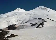 L'Elbrouz est un volcan endormi presque symétrique, selon un plan vertical, possédant deux pics principaux, de chaque côté d'un col situé à 5 416 mètres d'altitude : le sommet occidental est le point culminant à 5 643 mètres d'altitude[1] tandis que le sommet oriental s'élève à 5 621 mètres[7]. Le cratère de 300 à 400 mètres de diamètre, situé au sommet du pic oriental, a été progressivement comblé de neige et de glace[8]. Les névés du volcan, couvrant une superficie de 138 km2, alimentent vingt-deux (ou vingt-trois selon les sources[9]) glaciers principaux et soixante-dix-sept glaciers secondaires qui donnent naissance aux rivières Baksan, Kouban et Malka[5],[10]. Certains de ces glaciers, étudiés par des scientifiques depuis les années 1930[11], peuvent atteindre 400 mètres d'épaisseur mais tous sont en retrait, ayant perdu entre 80 et 500 mètres de longueur. Les deux principaux s'appellent Bolchoï Azaou (« le grand Azaou »), avec une superficie de 23 km2 et une longueur de 9,28 km, et Irik, avec une superficie de 10,2 km2 et une longueur de 9,31 km. Cette activité glaciaire a formé de nombreux lacs peu étendus mais profonds[9],[12].