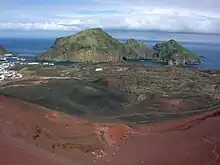 Vue du cône volcanique de l'Eldfell depuis l'entrée du port. | ||