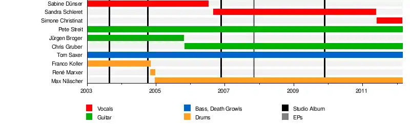 Le groupe sort trois albums avec leur première chanteuse, dont le dernier, Griefshire est un album concept. En juillet 2006, la chanteuse Sabine Dünser décède d'une hémorragie cérébrale à l'âge de 29 ans. Elis décide de sortir Catharsis qui suit la veine de son prédécesseur avec Sandra Schleret comme nouvelle chanteuse.