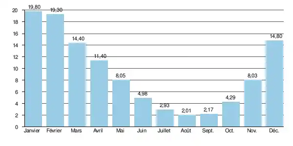 La pente moyenne de la rivière est de 0,375 % sur l'ensemble de son parcours mais présente d'importantes variations dues à des ruptures de pente et des replats. Ainsi, elle passe de 127 mètres à la station d'épuration de Barrégan à 75 mètres 2 500 mètres plus loin au Grand Pont. La pente moyenne de la rivière sur cette section est donc de 2 %. Par contre, elle passe de 55 mètres au confluent avec l'Inam à 52 mètres au confluent avec le Naïc 3 000 mètres plus loin. La pente moyenne sur cette autre section n'est donc que de 0,10 %[3].