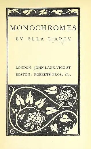 - (en) Ella D'Arcy, Monochromes, Londres, J. Lane, Boston, Roberts Bros, , 300 p. (ISBN 1-113-83285-1, lire en ligne)