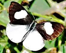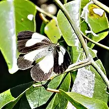 Ce papillon blanc de taille moyenne avec une envergure d'environ 50 mm présente des ailes antérieures à large bordure noire laissant une large tache blanche touchant la bordure costale. Les ailes postérieures présentent un dimorphisme suivant le sexe, chez le mâle blanches avec une fine bordure noire et chez la femelle une très large bordure noire.