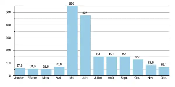 Les hautes eaux se déroulent au printemps, aux mois de mai et de juin, ce qui correspond au dégel et à la fonte des neiges du bassin. Dès le mois de juillet, le débit baisse fortement, puis se stabilise à un niveau assez élevé jusqu'au mois d'octobre.