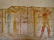 Temple de Min avec son emblème sur un bas-relief du temple de Ramsès II à Abydos.