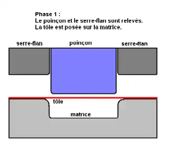 - Phase 1 : poinçon et serre-flan sont relevés. La tôle, préalablement graissée, est posée sur la matrice.