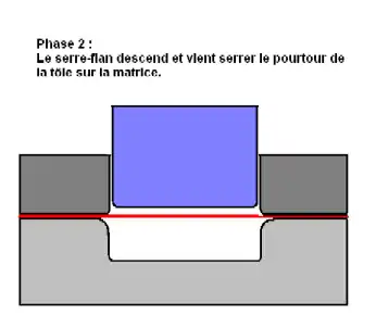 - Phase 2 : le serre-flan est descendu et vient appliquer une pression bien déterminée, afin de maintenir la tôle tout en lui permettant de glisser.