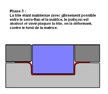 - Phase 3 : le poinçon descend et déforme la tôle de façon plastique en l’appliquant contre le fond de la matrice.
