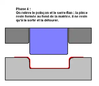 - Phase 4 : le poinçon et le serre-flan se relèvent : la pièce conserve la forme acquise (limite d’élasticité dépassée).