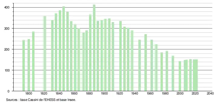 L'évolution du nombre d'habitants est connue à travers les recensements de la population effectués dans la commune depuis 1793. Pour les communes de moins de 10 000 habitants, une enquête de recensement portant sur toute la population est réalisée tous les cinq ans, les populations légales des années intermédiaires étant quant à elles estimées par interpolation ou extrapolation[34]. Pour la commune, le premier recensement exhaustif entrant dans le cadre du nouveau dispositif a été réalisé en 2008[35].