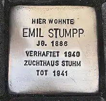 [11]En 2008, une pierre d'achoppement pour Emil Stumpp est posée devant la maison du Pfauenpforte 9 à Worms[12].