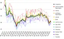 La Cour des comptes fait part de son scepticisme sur la politique budgétaire menée par l'exécutif, qui suscite en outre l'hostilité d'une majorité de la population[262],[263],[264],[265],[266]. En 2019, le Fonds monétaire international (FMI) exprime son inquiétude sur le mécontentement social et sur le niveau d'endettement de la France (98 % du PIB), indiquant que « la dette française a augmenté au cours des dernières années et [que] le pays dispose de peu de marge de manœuvre en cas de crise »[267],[268]. Cependant, le déficit de 2017 à 2019 se maintient sous les 3 % du PIB, avant une brusque dégradation avec la pandémie de Covid-19[269]. En tout, durant son premier mandat, le poids de la dette publique s’accroit de 600 milliards d’euros en cinq ans pour atteindre 2 950 milliards, soit 44 000 euros par Français. L’endettement de l’État franchit la barre symbolique des 100 % du PIB[270],[271].