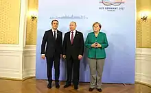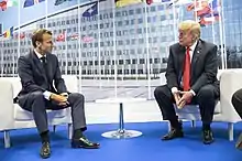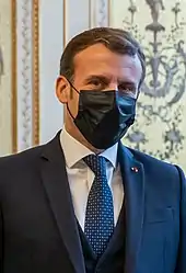 Le 14 mai 2017, Emmanuel Macron est investi président de la République française[240]. Il est le 8e président de la Cinquième République et le 25e président de la République française. Lors de son entrée en fonction, il est, à 39 ans, le plus jeune président français de l'histoire[alpha 9], le plus jeune dirigeant du G20 et le plus jeune chef d'État élu démocratiquement, exception faite du micro-État de Saint-Marin[alpha 10].
