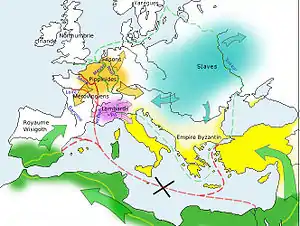 Au VIIe siècle, les royaumes barbares connaissent une période de crise et se morcellent. L'expansion musulmane[9] a longtemps été évoquée comme cause de cette crise[10] mais on connaît mieux désormais le rôle de l'Italie byzantine comme courroie de transmission ininterrompue entre l'Orient et l'Occident[11]. N'étant plus assurée par l'État romain disparu, la sécurité est désormais prise en charge par l'aristocratie germanique[12]. Les puissants accueillent des hommes libres, les éduquent, les protègent et les nourrissent. L'entrée dans ces groupes se fait par la cérémonie de la recommandation : ces hommes deviennent des guerriers domestiques (vassus) attachés à la personne du senior[13]. Le seigneur doit entretenir cette clientèle par des dons pour entretenir sa fidélité[12],[14]. La monnaie d'or devenant rare, la richesse provient surtout de la guerre : butin ou terres conquises à redistribuer. En l'absence d'expansion territoriale, les liens vassaliques se distendent, donc pour se pérenniser une puissance doit s'étendre.