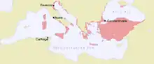Au VIe siècle, sous le règne de Justinien Ier (527-565), ses deux généraux Bélisaire et Narsès reconquièrent une grande partie des provinces occidentales : l'Italie, l'Afrique du Nord, et l'Hispanie du Sud[28]. Ils restaurent ainsi brièvement l'« Imperium Romanum » dans ses limites méditerranéennes, mais sans reprendre pied en Gaule. Cependant, les guerres contre les royaumes des Vandales et des Goths à l'ouest, et contre le puissant Empire sassanide de Khosro Ier à l'est, auxquelles vient s'ajouter une épidémie de peste (dite « peste de Justinien ») qui ravage à partir de 541 tout le bassin méditerranéen, affectent sérieusement l'équilibre de l'Empire[29]. Des recherches récentes lient cette épidémie à un refroidissement du climat mondial causé par plusieurs explosions volcaniques très importantes[30].
