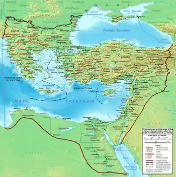 L’Empire byzantin plonge ses racines dans la période dite de l’Antiquité tardive, débutant traditionnellement[N 1] avec l’avènement de Dioclétien en 284[13].
