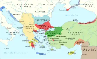 Après la mort d'Andronic III, l'Empire byzantin est déchiré par une nouvelle guerre civile destructrice entre Jean VI Cantacuzène (1347-1354) et la régence du jeune Jean V Paléologue (1341-1376). Celle-ci dure de 1341 à 1347 et épuise les maigres ressources de l'Empire. Les deux parties font régulièrement appel à des troupes de mercenaires des empires voisins, y compris des Turcs qui font leurs premiers pas en Europe[CH 4]. Si Jean VI en sort vainqueur, il règne sur un empire exsangue, privé des ressources commerciales qui ont fait sa richesse du fait de la concurrence des républiques italiennes de Venise et de Gênes qui installent des comptoirs commerciaux un peu partout dans l'ancien territoire byzantin. Jean VI finit par abdiquer en 1354, date à laquelle les Ottomans s'emparent de Gallipoli et s'installent de manière durable en Europe, au détriment des dernières possessions de l'Empire byzantin. Il ne faut que quelques années pour que les possessions de l'Empire se réduisent à sa capitale, aux environs directs de celle-ci, à Thessalonique (prise en 1387) et au despotat de Morée qui s'étend sur une partie du Péloponnèse. Les empereurs byzantins, désormais vassaux de l'Empire ottoman, tentent de faire appel à l'aide de l'Occident pour susciter une croisade. Finalement, Bayezid Ier met le siège devant Constantinople en 1394 et Manuel II Paléologue (1391-1425) entame un long voyage en Europe pour demander de l'aide. Une armée occidentale est cependant lourdement vaincue à Nicopolis en 1396 et seule la victoire d'Ankara de Tamerlan sur les Ottomans en 1402 sauve l'Empire byzantin[76].