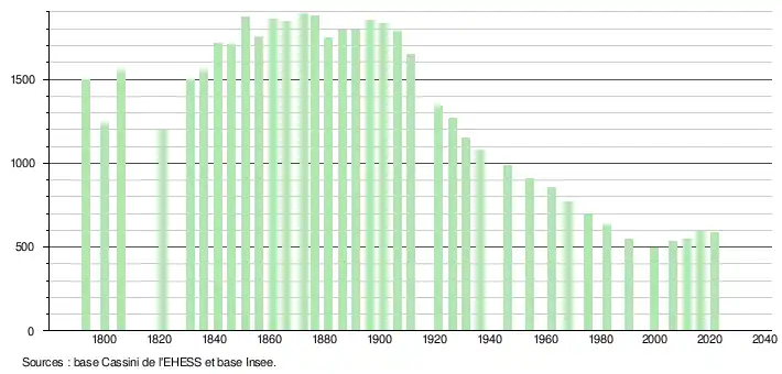 L'évolution du nombre d'habitants est connue à travers les recensements de la population effectués dans la commune depuis 1793. Pour les communes de moins de 10 000 habitants, une enquête de recensement portant sur toute la population est réalisée tous les cinq ans, les populations légales des années intermédiaires étant quant à elles estimées par interpolation ou extrapolation[22]. Pour la commune, le premier recensement exhaustif entrant dans le cadre du nouveau dispositif a été réalisé en 2006[23].