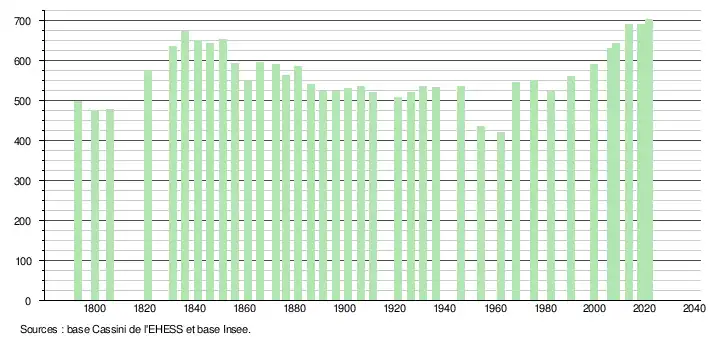 | L'évolution du nombre d'habitants est connue à travers les recensements de la population effectués dans la commune depuis 1793. Pour les communes de moins de 10 000 habitants, une enquête de recensement portant sur toute la population est réalisée tous les cinq ans, les populations légales des années intermédiaires étant quant à elles estimées par interpolation ou extrapolation[36]. Pour la commune, le premier recensement exhaustif entrant dans le cadre du nouveau dispositif a été réalisé en 2008[37]. En 2021, la commune comptait 703 habitants[Note 6], en augmentation de 0,86 % par rapport à 2015 (Haute-Garonne : +7,43 %, France hors Mayotte : +1,84 %). |
