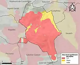 Le retrait-gonflement des sols argileux est susceptible d'engendrer des dommages importants aux bâtiments en cas d’alternance de périodes de sécheresse et de pluie. 86,7 % de la superficie communale est en aléa moyen ou fort (88,8 % au niveau départemental et 48,5 % au niveau national). Sur les 341 bâtiments dénombrés sur la commune en 2019, 340 sont en aléa moyen ou fort, soit 100 %, à comparer aux 98 % au niveau départemental et 54 % au niveau national. Une cartographie de l'exposition du territoire national au retrait gonflement des sols argileux est disponible sur le site du BRGM[30],[Carte 3].
