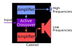Une enceinte active est une enceinte pour laquelle l'amplification est située en aval du filtrage.