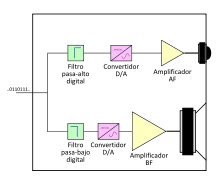Si le flux audio est un flux analogique déjà préamplifié, alors le flux est simplement filtré en fonction de la fréquence des haut-parleurs de l'enceinte. Puis chaque fréquence est amplifiée séparément pour attaquer un haut-parleur.