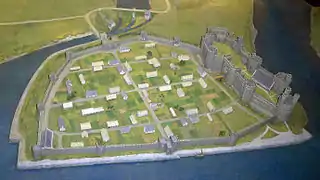 La ville nouvelle de Caernarfon est peuplée de colons anglais principalement originaires des comtés frontaliers du Cheshire et du Lancashire, et l'enceinte est en partie conçue pour encourager l'immigration en donnant un sentiment de sécurité aux habitants[4]. Elle n'attire cependant qu'un nombre d'immigrants modéré : en 1298, on n'y dénombre que 59 burgages (des propriétés de la Couronne louées à des particuliers), soit significativement moins qu'à Conwy ou qu'à Beaumaris, et la situation ne s'améliore pas au XIVe siècle[16].